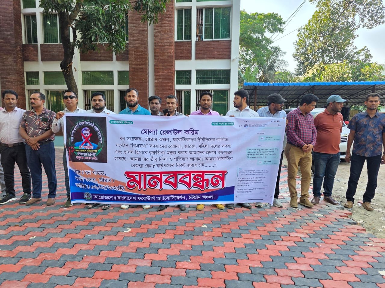 এরই প্রেক্ষিতে, (BFA) চট্টগ্রাম আঞ্চলিক কমিটির সভাপতি/সাধারণ সম্পাদক হিসাবে অত্র সংগঠনের পক্ষে উক্ত ঘটনার তীব্র নিন্দা ও প্রতিবাদ জানান। তাঁর এমন কুরুচিপূর্ণ আচরণে মাঠ পর্যায়ে প্রশাসন ভেঙে পড়েছে। অবিলম্বে এমন হীন মন মানসিকতার অফিসারকে চট্টগ্রাম সার্কেল থেকে অপসারণ করার জোর দাবিও জানান। এছাড়া সংগঠনের পক্ষ থেকে ঘোষিত কর্মসূচির মধ্যে রয়েছে ড. মোল্লা রেজাউল করিম, বন সংরক্ষক, চট্টগ্রাম অঞ্চলের অপসারনের দাবিতে স্মারকলিপি প্রদান। ও আগামী ০৭/০৫/২০২৫ খ্রিঃ তারিখ হতে ড. মোল্লা রেজাউল করিম, বন সংরক্ষককে চট্টগ্রাম অঞ্চলের বন সংরক্ষক পদ হতে অপসারণ না করা পর্যন্ত সকল বিভাগীয় কার্যালয়ে অবস্থান কর্মসূচী পালন।