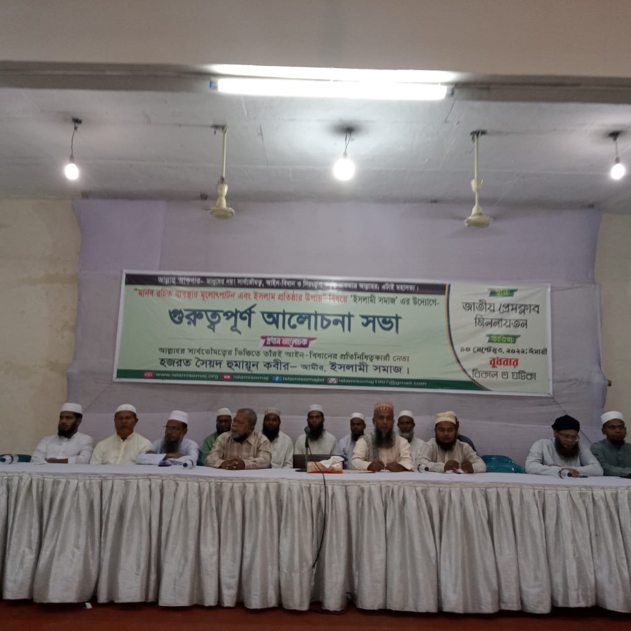 উক্ত আলোচনা সভায় সভাপতিত্ব করেন ইসলামী সমাজের আমীর হযরত সৈয়দ হুমায়ূন কবির, বক্তব্য রাখেন আবু জাফর মোহাম্মদ ইকবাল, মোহাম্মদ ইয়াছিন সোলায়মান কবির, মোহাম্মদ ইউসুফ আলী মোল্লা।