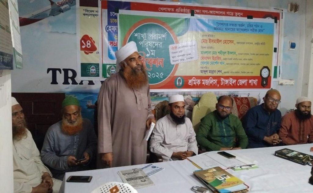 আজ ২৪ মে ২০২৫ শনিবার বিকাল ৩.৩০ মিনিট হতে শ্রমিক মজলিস টাঙ্গাইল জেলা শাখার উদ্যোগে শাখা পরামর্শ পরিষদের ১ম অধিবেশন অনুষ্ঠিত হয়। এতে প্রধান অতিথি হিসেবে নির্বাচন কার্যক্রম পরিচালনা করেন সংগঠনের সহ-সাধারণ সম্পাদক মাওলানা মোঃ ইসমাইল হোসেন। সহকারি নির্বাচন কমিশনার হিসেবে উপস্থিত ছিলেন শ্রমিক মজলিসের কেন্দ্রীয় নির্বাহী পরিষদ সদস্য মোঃ ইব্রাহিম খলিল। অধিবেশনে ২০২৫-২০২৬ সেশনের জন্য ১৫ সদস্য বিশিষ্ট টাঙ্গাইল জেলা শাখা পুনর্গঠন করা হয়। সভায় মেহমান হিসেবে উপস্থিত ছিলেন খেলাফত মজলিস টাঙ্গাইল জেলা সহ-সভাপতি মুফতি আব্দুর রহমান, সাধারণ সম্পাদক মাওলানা শহিদুল ইসলাম প্রমুখ।