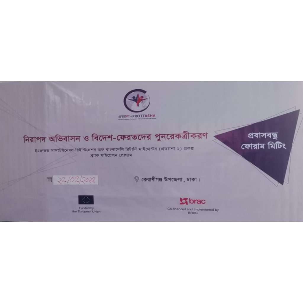 ব্র্যাক মাইগ্রেশন প্রোগ্রামের প্রত্যাশা-২ প্রকল্পের আওতায় ২৫ মে২০২৫বেলা ১১ টায় কেরানীগঞ্জ উপজেলার রুহিতপুর(দেওয়ান বাড়ি) অফিসে প্রবাসবন্ধু ফোরামের সভা অনুষ্ঠিত হয়। সভায় পূর্ববর্তী মিটিংয়ের কার্যক্রম বাস্তবায়নের পুনরালোচনা ও অগ্রগতি যাচাই ও সম্প্রসারণ করার লক্ষে নতুন কমিটি গঠন করা হয়