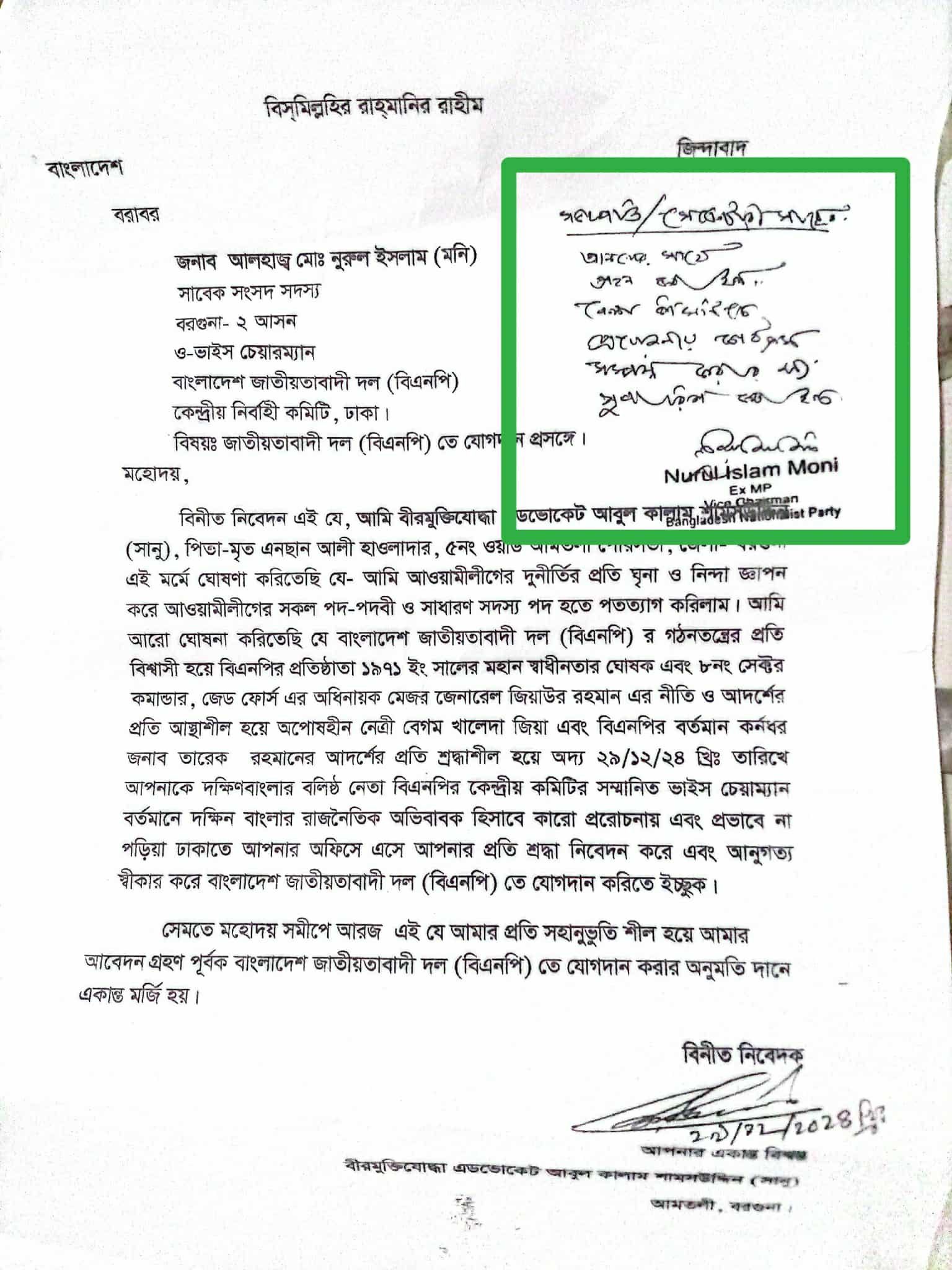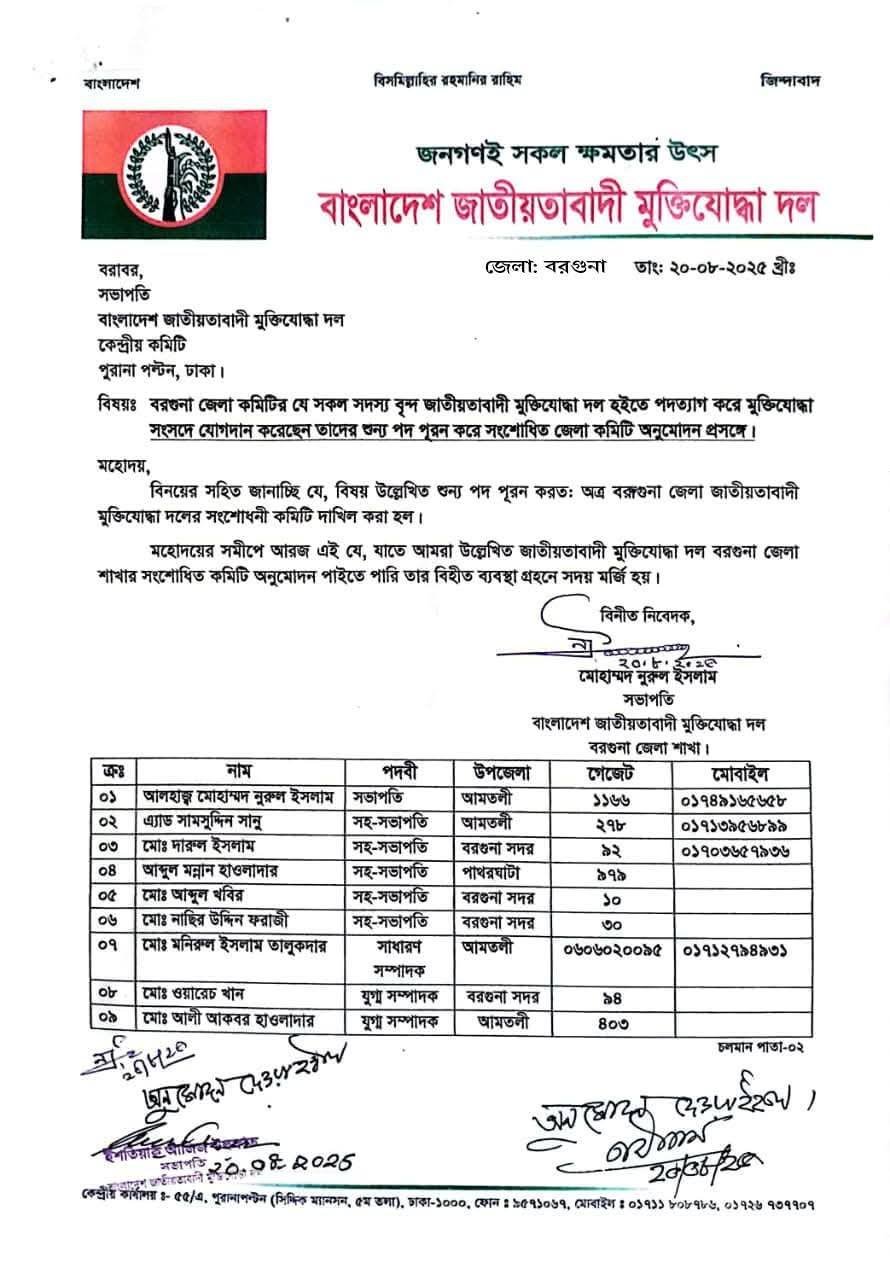 বাংলাদেশ জাতীয়তাবাদী মুক্তিযোদ্ধা দল বরগুনা জেলা শাখার পুনর্গঠিত কমিটিতে সভাপতি হয়েছেন বিগত আওয়ামী সরকারের অবৈধ নির্বাচনে প্রার্থী হওয়া নুরুল ইসলাম। একই কমিটিতে সহ সভাপতির পদ পেয়েছেন আমতলী উপজেলা আওয়ামী লীগের কার্যকরী কমিটির সহ-সভাপতি,সাবেক উপজেলা ভাইস চেয়ারম্যান বীরমুক্তিযোদ্ধা অ্যাডঃ একেএম সামসুদ্দিন সানু ওরফে কমান্ডার সানু। অবশ্য সহ সভাপতির পদ পাওয়া একেএম শামসুদ্দিন সানু জানান তিনি বিএনপির কেন্দ্রীয় কমিটির চেয়ারম্যান আলহাজ্ব নুরুল ইসলাম মনির সাথে সাক্ষাৎ করে বিএনপিতে যোগদান করেছেন।