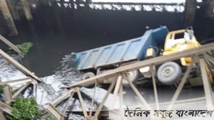 টঙ্গীতে তুরাগ নদীর ওপর নির্মিত একটি বেইলি ব্রিজ ভেঙে নদীর পানিতে পাথর বোঝাই ট্রাক পড়ে গেছে। আজ ভোররাত সাড়ে ৩টার দিকে টঙ্গী বাজারে তুরাগ নদীর ওপরের ব্রিজটি ভেঙে যায়।