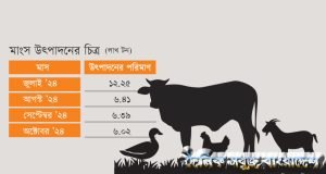 সরকারি হিসাবেও মাংস উৎপাদনের তথ্যে ব্যাপক নিম্নমুখী প্রবণতা লক্ষ করা গেছে। সরকারি পরিসংখ্যান অনুসারে তিন মাসের ব্যবধানে মাংস উৎপাদন বা ভোগ কমেছে প্রায় ৫০ শতাংশ। প্রাণিসম্পদ অধিদপ্তরের তথ্যমতে, গত জুলাইয়ে দেশে মাংস উৎপাদন ছিল ১২ লাখ ২৫ হাজার টন। কিন্তু আগস্টের ছাত্র-জনতার আন্দোলন ও নতুন সরকারের দায়িত্ব গ্রহণের পটভূমিতে মাংস উৎপাদন নেমে এসেছিল ৬ লাখ ৪১ হাজার টনে। সেপ্টেম্বরে নিম্নমুখী ধারা অব্যাহত ছিল। সে মাসে মাংস উৎপাদন হয়েছিল ৬ লাখ ৩৯ হাজার টন। সর্বশেষ অক্টোবরেও মাংস উৎপাদন হয়েছিল মাত্র ছয় লাখ টন। অর্থাৎ তিন মাসের ব্যবধানে দেশে মোট মাংস উৎপাদন বা ভোগ অর্ধেকে নেমে এসেছে।