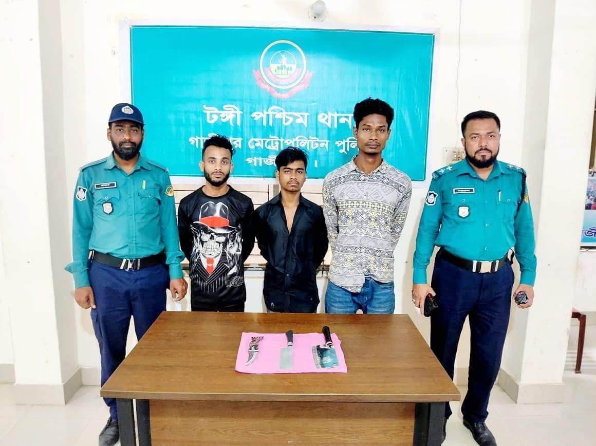 গত ১২ ই ফেব্রুয়ারি ২০২৩ ইং তারিখে বিশেষ অভিযান ও মাদক দ্রব্য উদ্ধার অভিযান পরিচালনাকালে টঙ্গী পশ্চিম থানাধীন খরতৈল সাকিনস্থ সাতাইশ রোড সুখিনগর আলী নেতার বাড়ীর সামনে কতিপয় দুস্কৃতিকারী ধারালো অস্ত্রে শস্ত্রে সজ্জিত হইয়া ডাকাতির জন্য সমাবেত হইয়া ডাকাতির প্রস্তুতি নিতেছে। উক্ত সংবাদের ভিত্তিতে উপ-পুলিশ কমিশনার (অপরাধ দক্ষিণ ) মোঃ মাহবুব উজ-জামান এর নির্দেশ টঙ্গী পশ্চিম থানার সুযোগ্য অফিসার ইনচার্জ মোঃ শাহ্ আলম এর নেতৃত্বে চৌকস পুলিশ অফিসার এসআই(নিঃ)মোঃ নজরুল ইসলাম সঙ্গীয় অফিসার ও ফোর্স সহ আসামী ১। রাজ (২৪), পিতা-শাহ আলম, মাতা-আলেয়া, স্থায়ী গ্রাম-খরতৈল ব্যাংকপাড়া (ছাপড়া মসজিদের পাশে), উপজেল/থানা-টঙ্গী পশ্চিম, গাজীপুর মহানগর, গাজীপুর, ২। মোঃ মিজান (১৯), পিতা-মৃত গাজী সুলতান, মাতা-সাবিনা বেগম, স্থায়ী গ্রাম-কলাপাড়া, উপজেলা/থানা-নকলা, জেলা-শেরপুর, বর্তমান গ্রাম-আমতলী বস্তি, রুমান মিয়ার বাসা, উপজেলা/থানা-টঙ্গী পূর্ব, গাজীপুর মহানগর, গাজীপুর, ৩। রবিন (১৮), পিতা-শাহজাহান, মাতা-রুবি, স্থায়ী গ্রাম-জোহাতলা (হাবুলের বাড়ী), উপজেলা/থানা-জামালপুর সদর, জেলা-জামালপুর, বর্তমান গ্রাম-গাজীপুরা, সুমন মার্কেট, উপজেলা/থানা-টঙ্গী পূর্ব, গাজীপুর মহানগর আটক করে। আসামীদের নিকট হইতে ০১ টি সুইচ গিয়ার (চাকু), ০২ টি স্টীলের চাপাতি উদ্ধার করা হয়।গ্রেফতারকৃত আসামী সহ পলাতক আসামীদের বিরুদ্ধে টঙ্গী পশ্চিম থানার নিয়মিত মামলা নং-০৬, ধারা-৩৯৯/৪০২ পেনাল কোড রুজু করা হয়েছে। এ বিষয়ে টঙ্গী পশ্চিম থানার অফিসার ইনচার্জ মোঃ শাহ্ আলম বলেন, আসামীদের বিরুদ্ধে মামলা হয়ে এবং পলাতক আসামীদের গ্রেফতারের চেষ্টা চলছে। আমার থানা এলাকায় প্রতিনিয়ত মাদক,চুরি,ছিনতাই,ডাকাতি সহ সকল অপরাধ মূলক কর্ম কান্ডের বিরুদ্ধে নিয়মিত অভিযান চলবে।