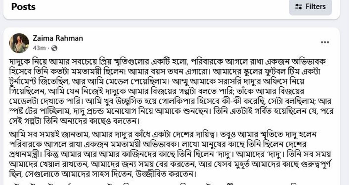 স্ট্যাটাসে জাইমা রহমান লেখেন, দাদুকে নিয়ে তার জীবনের সবচেয়ে প্রিয় স্মৃতিগুলোর একটি হলো—পরিবারের অভিভাবক হিসেবে তার অগাধ মমতা। তখন তার বয়স ছিল মাত্র এগারো বছর। স্কুল ফুটবল টিম একটি টুর্নামেন্টে চ্যাম্পিয়ন হয়েছিল এবং তিনি নিজেও একটি মেডেল পেয়েছিলেন। সেই আনন্দ ভাগ করে নিতে মা তাকে সরাসরি দাদুর অফিসে নিয়ে যান, যেন নিজের মুখেই দাদুকে বিজয়ের গল্প বলতে পারেন। গোলকিপার হিসেবে কীভাবে খেলেছেন, তা উচ্ছ্বাসের সঙ্গে বলতে বলতে তিনি অনুভব করেছিলেন—দাদু গভীর মনোযোগ দিয়ে তার কথা শুনছেন। সেই সাফল্যে দাদু এতটাই গর্বিত হয়েছিলেন যে, পরবর্তীতে অন্যদের কাছেও সেই গল্প বারবার বলতেন।