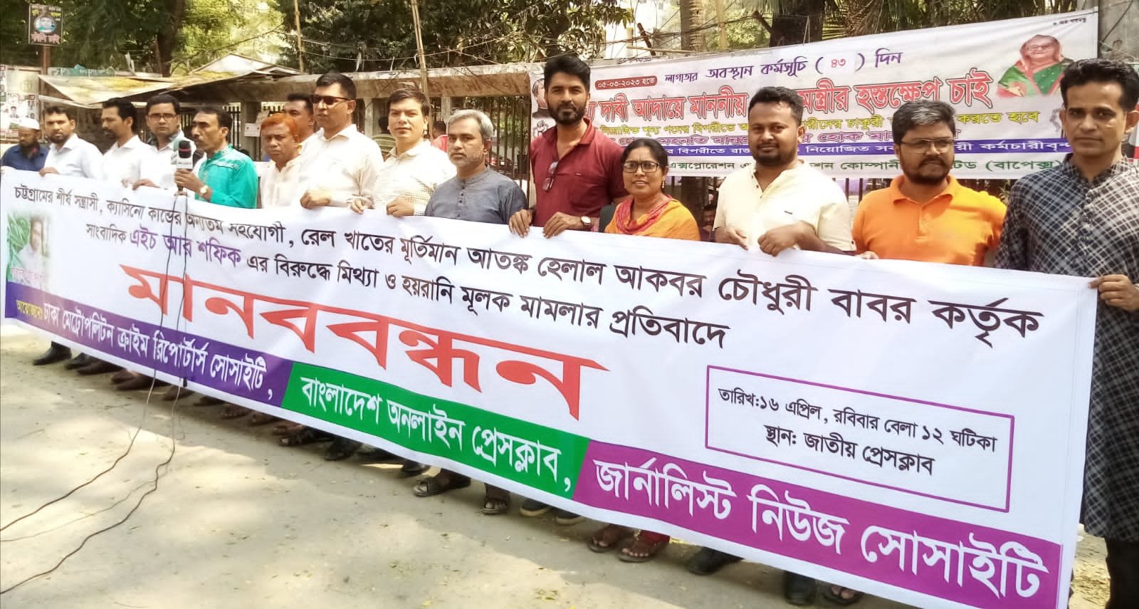 ঢাকা সাংবাদিক ইউনিয়নের সদস্য সাংবাদিক হাফিজুর রহমান শফিকের বিরুদ্ধে চট্টগ্রামের শীর্ষ সন্ত্রাসী, ক্যাসিনো কান্ডের অন্যতম সহযোগী, রেল খাতের মূর্তিমান আতঙ্ক হেলাল আকবর চৌধুরী বাবর কর্তৃক মিথ্যা ও হয়রানি মূলক মামলার প্রতিবাদে ঢাকা মেট্রোপলিটন ক্রাইম রিপোর্টার্স, বাংলাদেশ অনলাইন প্রেসক্লাব ও জার্নালিস্ট নিউজ সোসাইটির সম্মিলিত আয়োজনে জাতীয় প্রেসক্লাবের সামনে মানববন্ধন কর্মসূচি পালন করা হয়েছে।