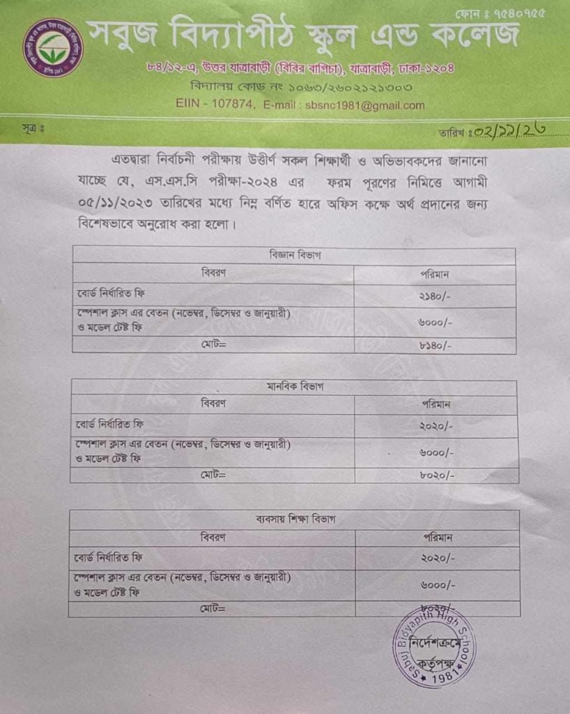 এস.এস.সি ফরম পূরণে অতিরিক্ত ফি আদায় সবুজ বিদ্যাপীঠ উচ্চ বিদ্যালয় স্কুলের দূর্নীতি