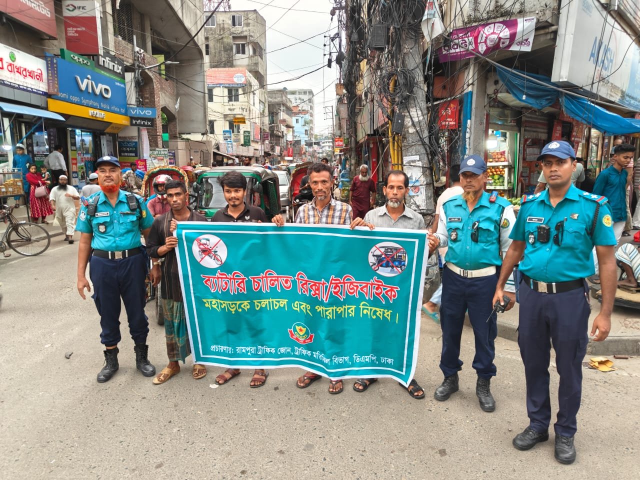 আয়েশা আক্তার ঃ রামপুরা ডিআইটি রোডে শৃঙ্খলা ফেরাতে ব্যাটারি চালিত ইজিবাইক রিকশা চলাচলে বিধিনিষেধ আরোপে বিভিন্ন কর্মসূচী হাতে নিয়েছে রামপুরা ট্রাফিক পুলিশ জোন । বিগত ৩১-০৫-২০২৪ হতে ৪ মে পর্যন্ত চার দিনব্যাপী রামপুরা ট্রাফিক জোনের প্রধান সড়ক সমূহে ব্যাটারি চালিত রিক্সা/ইজিবাইক বন্ধে জনসাধারণ ও ব্যাটারি চালিত রিক্সা মালিকদের সচেতন করতে সচেতনতা মূলক ব্যানার প্রদর্শন এবং মাইকিং করা হয়।