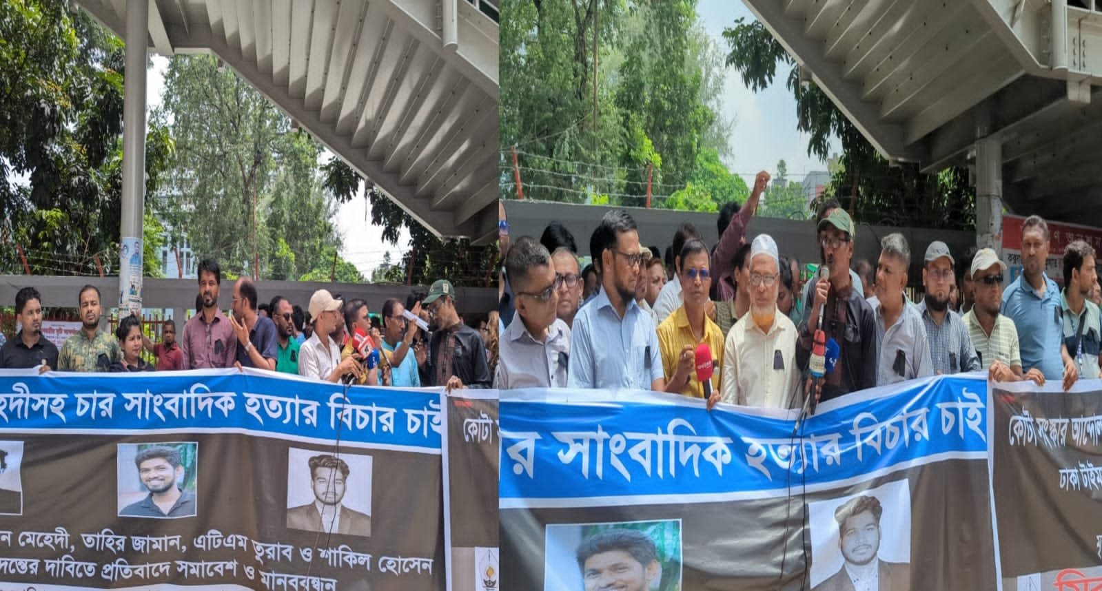 চলমান আন্দোলনে পুলিশের গুলিতে সাংবাদিক হাসান মেহেদীসহ চার সাংবাদিককে হত্যার বিচার চেয়ে বুধবার (৩১ জুলাই) জাতীয় প্রেসক্লাবের সামনে দুপুর ১২টায় সাধারণ সাংবাদিক সমাজ কর্তৃক প্রতিবাদ সমাবেশ ও মানববন্ধন করেছে সাংবাদিকবৃন্দ। উক্ত সংগঠনের আহবায়ক সিনিয়র সাংবাদিক সাইদুর রহমানের সভাপতিত্তে ও মোহাম্মদ মাসুদ এর সঞ্চালনায় উক্ত মানববন্ধনে দেশের বিভিন্ন সাংবাদিক সংগঠনের নেতাকর্মীরা তাদের সংগঠন কর্তৃক একাধিক ব্যানারে উপস্থিত ছিলেন-ফেডারেশন অব বাংলাদেশ জার্নালিস্ট অর্গানাইজেশন, বাংলাদেশ ক্রাইম রিপোর্টার্স ফোরাম, জাতীয় রিপোর্টার্স ক্লাব, মিরপুর প্রেসক্লাব, পূর্বাঞ্চল সাংবাদিক ইউনিট, মিরপুর রিপোর্টার্স ক্লাব, জার্নালিষ্ট কমিউনিটি অব বাংলাদেশের, গ্লোবাল জার্নালিষ্ট কাউন্সিল ইন বাংলাদেশ,বাংলাদেশ মফস্বল সাংবাদিক ফাউন্ডেশন, এশিয়ান জার্নালিষ্ট সোসাইটি, খিলক্ষেত প্রেসক্লাব, মিরপুর রিপোর্টাস ইউনিটি, কেরানীগঞ্জ মডেল প্রেসক্লাব, কদমতলী সাংবাদিক ক্লাব, শ্যামপুর প্রেসক্লাব, ঢাকা মেট্রোপলিটন ক্রাইম রিপোর্টার্স সোসাইটি, ডেমরা থানা প্রেসক্লাব, বাংলাদেশ মফস্বল সাংবাদিক সোসাইটি সহ আরো একাধিক সাংবাদিক সংগঠন ও সংগঠনের সভাপতি ও সাধারন সম্পাদক নেতৃবৃন্দ উপস্থিত ছিলেন।