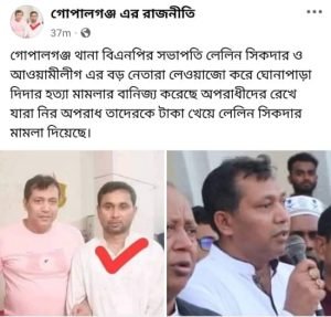 গোপালগঞ্জ জেলার সদর থানা বিএনপির বর্তমান সভাপতি সিকদার শহিদুর ইসলাম লেনিন এর বিরুদ্ধে বিস্তর অভিযোগ সদর থানা বিএনপি এবং অঙ্গ সংগঠনের নেতাকর্মীদের। সদর থানা বিএনপির নির্যাতিত এবং অঙ্গ সংগঠনের নেতৃবৃন্দদের অভিযোগ ফ্যাসিস্ট শেখ হাসিনা ও তার দোসরদের পলায়ন করার পর ও গোপালগঞ্জ সদর এখনো আওয়ামী লীগ এবং তাদের দোসরদের নিয়ে তিনি বিএনপি নেতাকর্মীদের নির্যাতন অব্যাহত রেখেছেন। বিগত নির্বাচন গুলোতে বিশেষ করে উপজেলা, পৌর,এবং জাতীয় নির্বাচনের সময় আওয়ামী লীগের জাতীয় নেতা শেখ ফজলুল করিম সেলিমের নির্বাচন পরিচালনা করেন। জাতীয় নির্বাচনের প্রচারণায় সিকদার লেনিন আওয়ামী লীগের বিভিন্ন সভা ও সমাবেশে নৌকার পক্ষে ভোট চেয়ে লিফলেট বিতরণ করেন। এ সংক্রান্ত তথ্য প্রমান এ প্রতিবেদকের কাছে জমা রয়েছে। কেন্দ্র ঘোষিত বিএনপির যে সকল কর্মসূচি ঘোষিত হতো সাংগঠনিক বৃত্তি মজবুত হবে এরকম কর্মসূচি পালন না করে তিনি তার অনুগত লোকজনকে দিয়ে দায় সারা কর্মসূচি করে আওয়ামী এজেন্ডরা বাস্তবায়ন করেছেন,যাতে গোপালগঞ্জের বিএনপি সাংগঠনিকভাবে মজবুত না হয়। যাতে সাপ ও না মরে লাঠিও না ভাঙ্গে। এর কারণ হিসেবে অনুসন্ধান করে জানা যায় তার সাথে সম্পর্ক রয়েছে আওয়ামী লীগের সাবেক এমপি শেখ সেলিম এবং সাবেক প্রধানমন্ত্রী শেখ হাসিনার সাবেক এ পি এস হাফিজুর রহমান লিপুর সাথে রয়েছে তার ঘনিষ্ঠ সম্পর্ক। যার ধরুন তিনি প্রশাসনকে ম্যানেজ করে তার অনুসারী এবং আওয়ামী দোসরদের নিয়ে দায়সারা ভাবে কেন্দ্র ঘোষিত কর্মসূচি পালন করতেন।