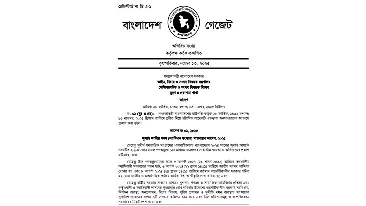 জুলাই সনদ বাস্তবায়ন আদেশ জারি